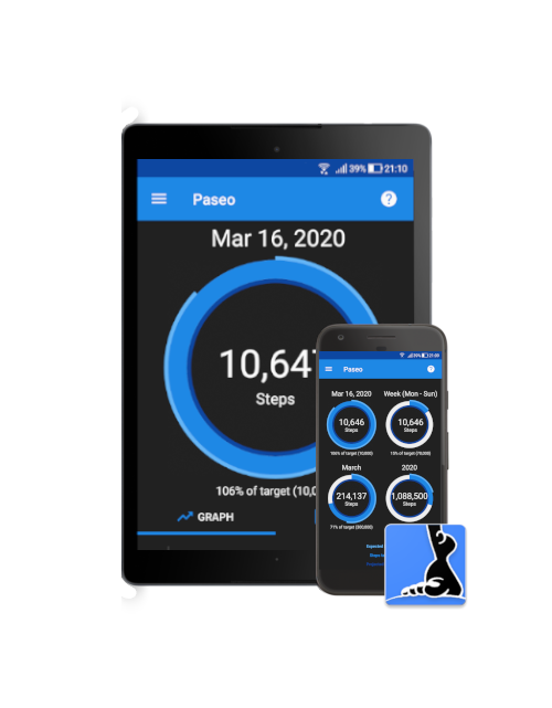 Paseo uses an Android device's built-in step sensor to maintain a history of steps taken (walking, running, jumping, or any other activity that the device interprets as steps).